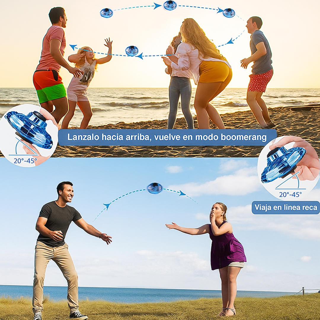 ¡Es muy fácil! Lo enciendes con el botón, lo agitas un poco para que se activen los motores y las luces, y lo lanzas suavemente. Dependiendo del ángulo en que lo lances, ¡volverá a ti como un boomerang mágico!